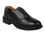 Black smooth leather safety shoe. Padded collar for added comfort. Steel toe cap and composite midsole protection. Moisture wicking inner lining. Dual density polyurethane outsole. Anti-Static. A lightweight executive style uniform shoe for lightweight duties.